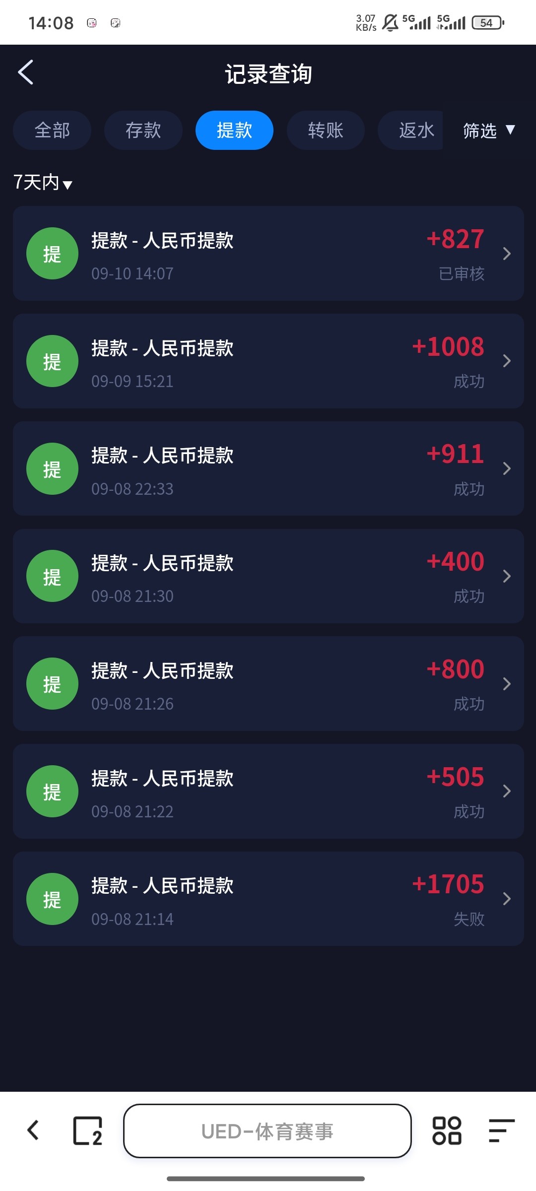 这几天ued一直放大水,第一天充300,出款1700,然后又充300打到600,没提挂了,第二天充300打到1000多,然后贪了一点只提了911,第三天继续300打到1800多,贪了只提了1000,今天非凡输了800,ng输了400,然后又去玩ued充了1000,出款3000