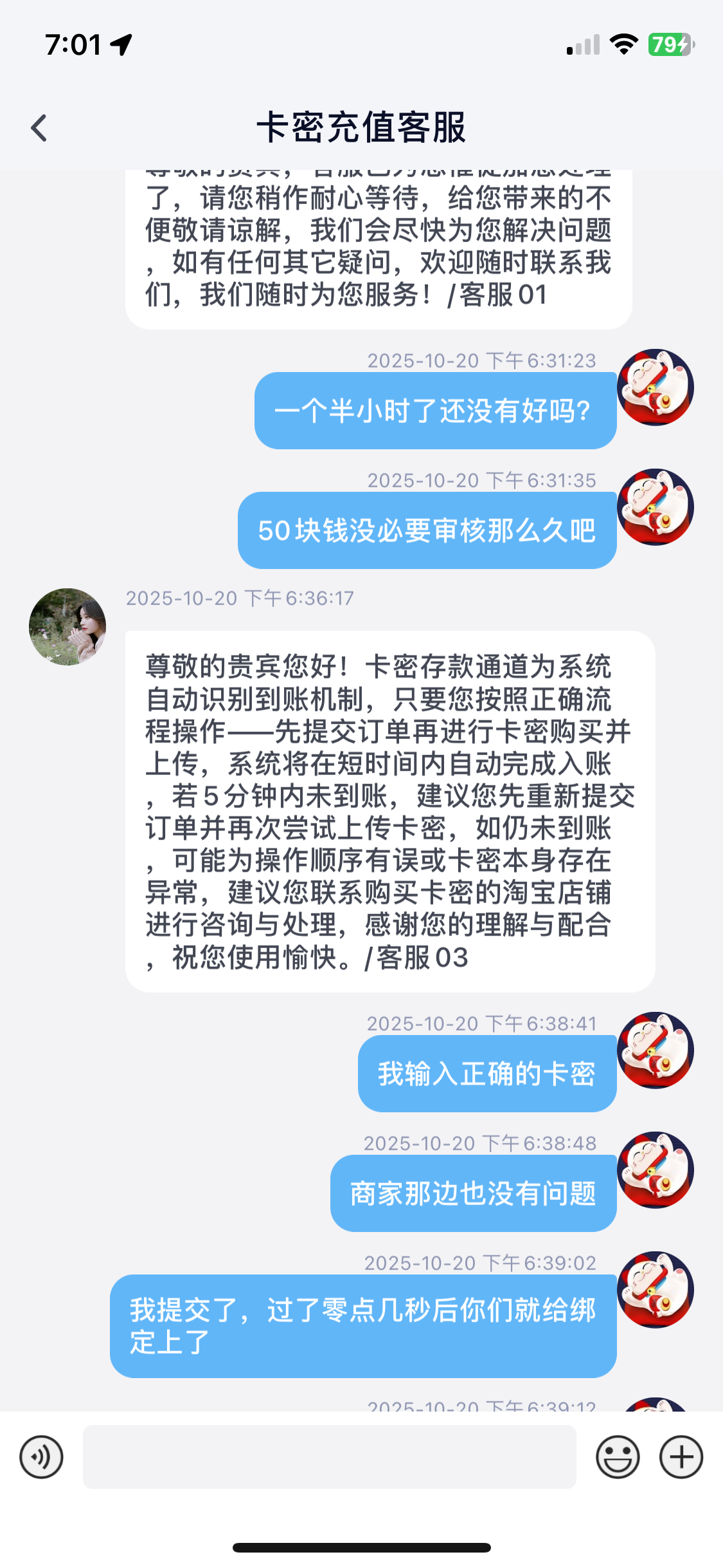 保时捷我充50卡密都要黑我刚买的卡密立马提交,他立马绑定,一直没有到帐,问客服之后一直拖从5:00拖到6:30结果他把我黑了50块钱都要黑