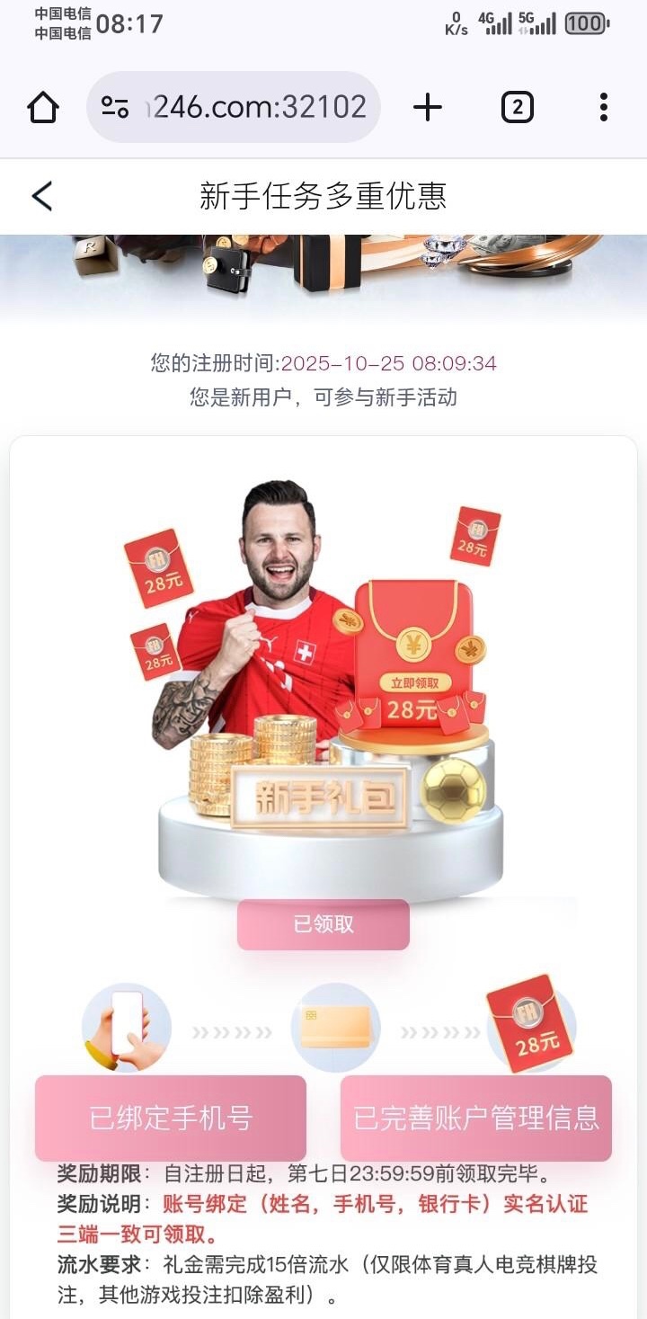注册自己实名绑卡优惠里面领取新人28,权限体育真人电竞棋牌网址:https://www.9fh246.com