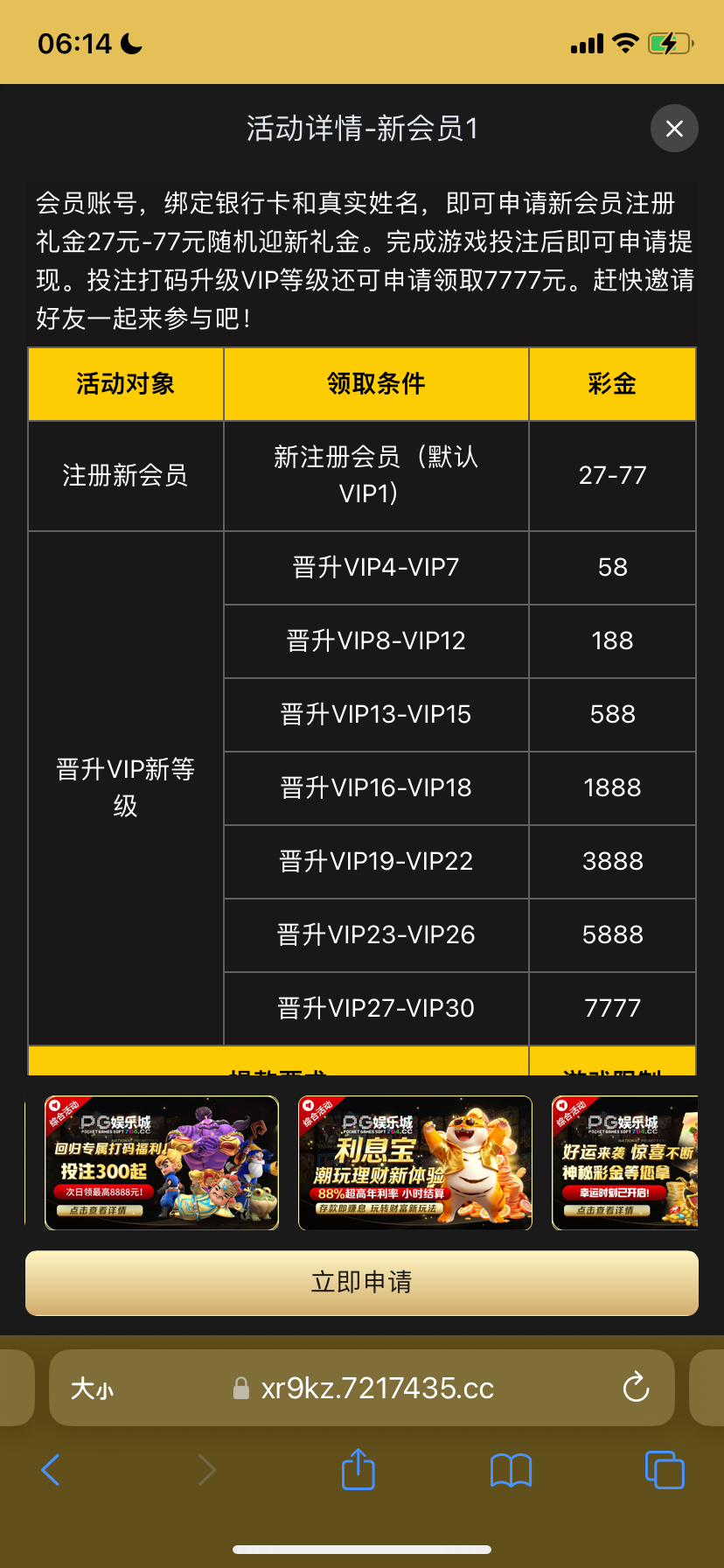 https://4737568.sanqy.com.cn:13007/?shareName=pgfx&invite_code=870185068注册秒27,没有秒就实名绑钱包手机号即可前往优惠大厅自行申请27彩金,仅限pg电子游戏,提现不知道,没打出来