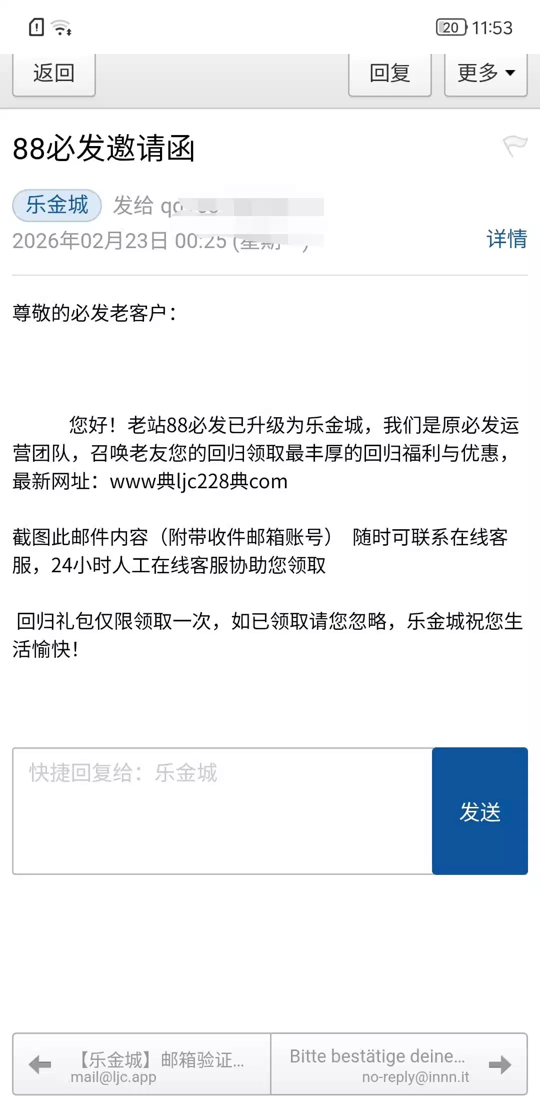 乐金城发邮件送了我188 说是之前的88必发升级,有的可以看看能不能出我也不知道,还没打链接www.ljc228.com