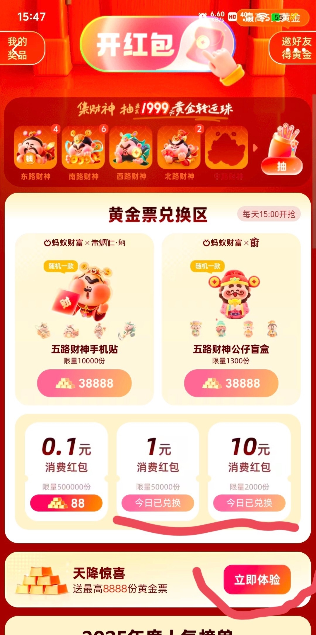 首页那个抽黄金票活动就是,没看见搜索开门红即可。然后进去下滑有一个下载蚂蚁财富送8888黄金票的一定要做,然后去开红包刷任务,任务优先做定投类任务,因为这种任务只需要设置日期定攒就完成 不需要真的转一笔什么的,完全0成本。